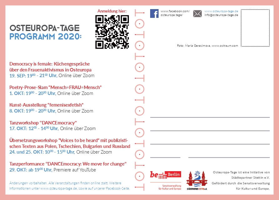 „Osteuropa-Tage. Central & Eastern Europe: Masculine (un?)democratic reality & future?“ ist ein interkulturelles Festival, das sich zum Ziel setzt, verschiedene Aspekte der Kultur, Literatur und Kunst osteuropäischer Länder vor einem breiten Berliner Publikum zu präsentieren. Der Schwerpunkt des Programms 2019-2020 liegen auf Demokratie und Frauenstellung in Polen, Bulgarien, Tschechien und Russland.